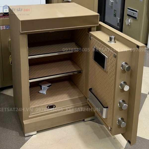 Bên trong két được bố trí 4 ngăn lưu trữ rộng, phù hợp để cất giữ nhiều loại tài sản như tiền mặt, hồ sơ, giấy tờ quan trọng, trang sức và các vật dụng cá nhân có giá trị.